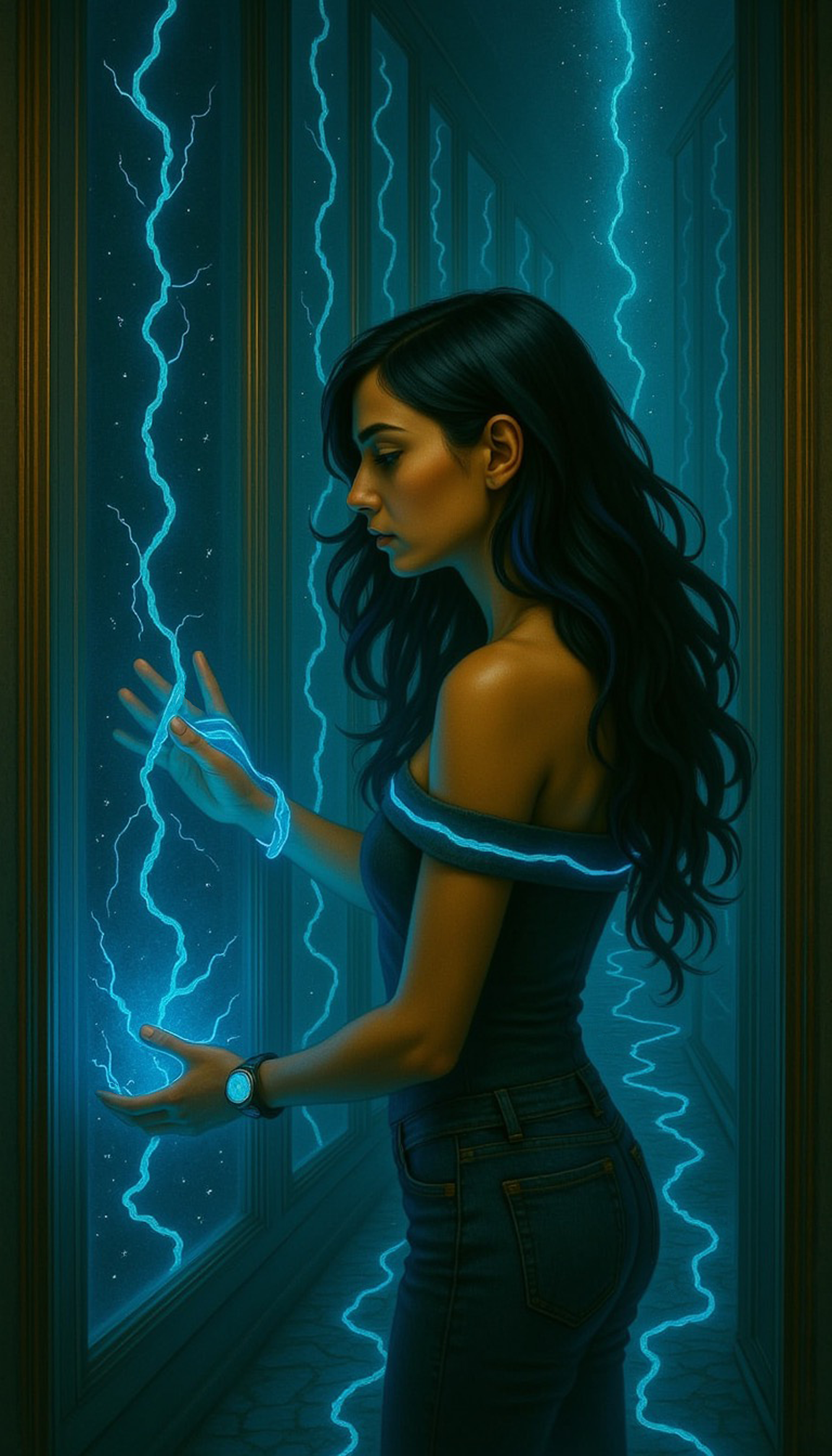 This scene from Reality 8963 is part of The Zepherous Chronicles Official Art Set: a visual exploration of fractured timelines, memory echoes, and the storm that follows Zeph wherever she goes. This piece captures her in a rare still moment between realities, wrapped in electricity, reflection, and the pulse of the watch that binds every timeline together. Created using a blend of hand drawing, and hand-finished Photoshop work, the image continues the evolving aesthetic of the Zepherous Universe: neon-lit, emotionally charged, and grounded in cinematic sci-fi atmosphere.